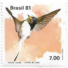 O selo do Brasil de 1981 destaca o beija-flor Chifre de Ouro de nome científico Heliactin bilophus.